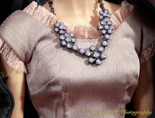 The suit is gorgeous. The fabric is a silky weave with a medium sheen that seems to have silver threads in amongst the off white and taupe. The jacket is wonderfully constructed with properly scaled buttons. Actual closures are hooks and eyes. But when the jacket is closed, the necklace won't lay flat on the doll. The necklace itself is awkward because if the component beads turn, getting them to all lay in the same direction is a nightmare. My necklace fell apart yesterday.